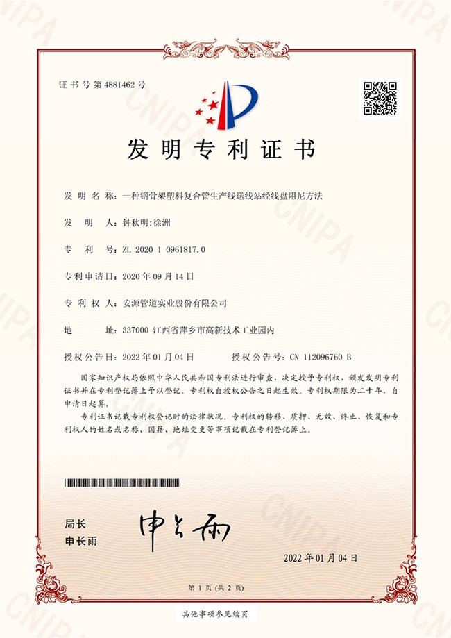 近日,安源管道公司发明的《一种钢骨架塑料复合管生产线送线站经线盘阻尼方法》,获得国家知识产权发明专利,解决了钢骨架塑料复合管生产领域的技术难题,管材的品质得到进一步提升,同时又可节约材料成本。