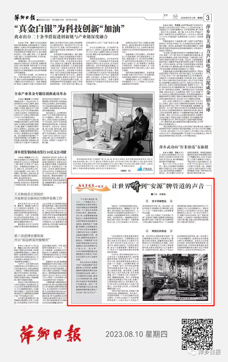 “管材不能只看外表,还需要了解它的抗压性、耐腐蚀性等。举个例子,有些原本需要一个小时才能制作完成的管材,15分钟内也能生产,但这种管材埋在地下,可能不到2个月就会开裂。而这些光从表面是看不到的。”在该公司党委书记、董事长张伟华看来,质量管控和品牌经营是企业不可忽视的内外两面。2022年11月,安源管道公司引进了钢骨架塑料复合管车间信息化生产追溯平台,从原材料到成品,建立了产品全生命周期智能监督系统,进一步加强了产品的质量管控,也推动企业向智能化数字化管理转型。在谈及企业未来的发展时,张伟华表示将再接再厉,抓创新抓发展,争取将安源管道打造成全国钢骨架塑料复合管件的生产物流中国中心,成功在北交所完成上市。
